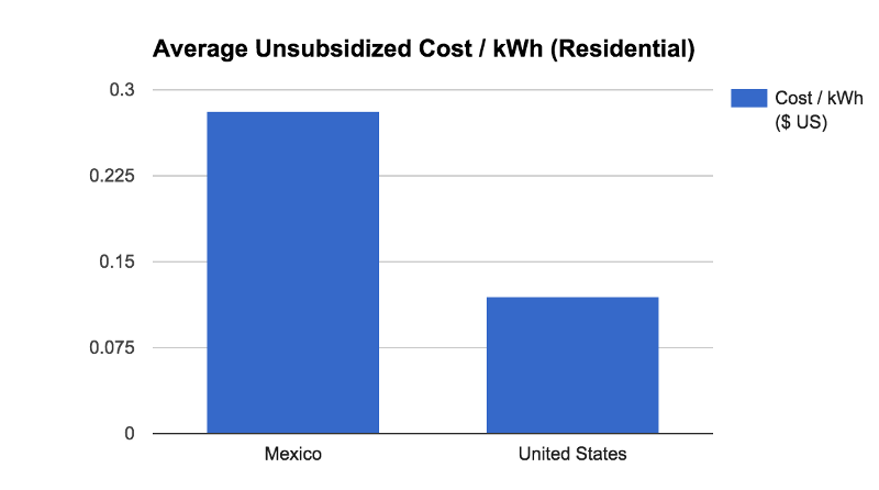 El costo de la energía no subsidiada en México es más de $4 pesos por kWh (más de 28 centavos de dólar por kWh). En contexto, es más del doble del costo promedio de la electricidad en los Estados Unidos (12,35 centavos / kWh) y casi 50% más que la energí­a más cara de los EE.UU. (20,83 centavos en Nueva Inglaterra). Hay varios motivos que causan el alto costo de la energía en México, los cuales analizaremos en un futuro próximo.